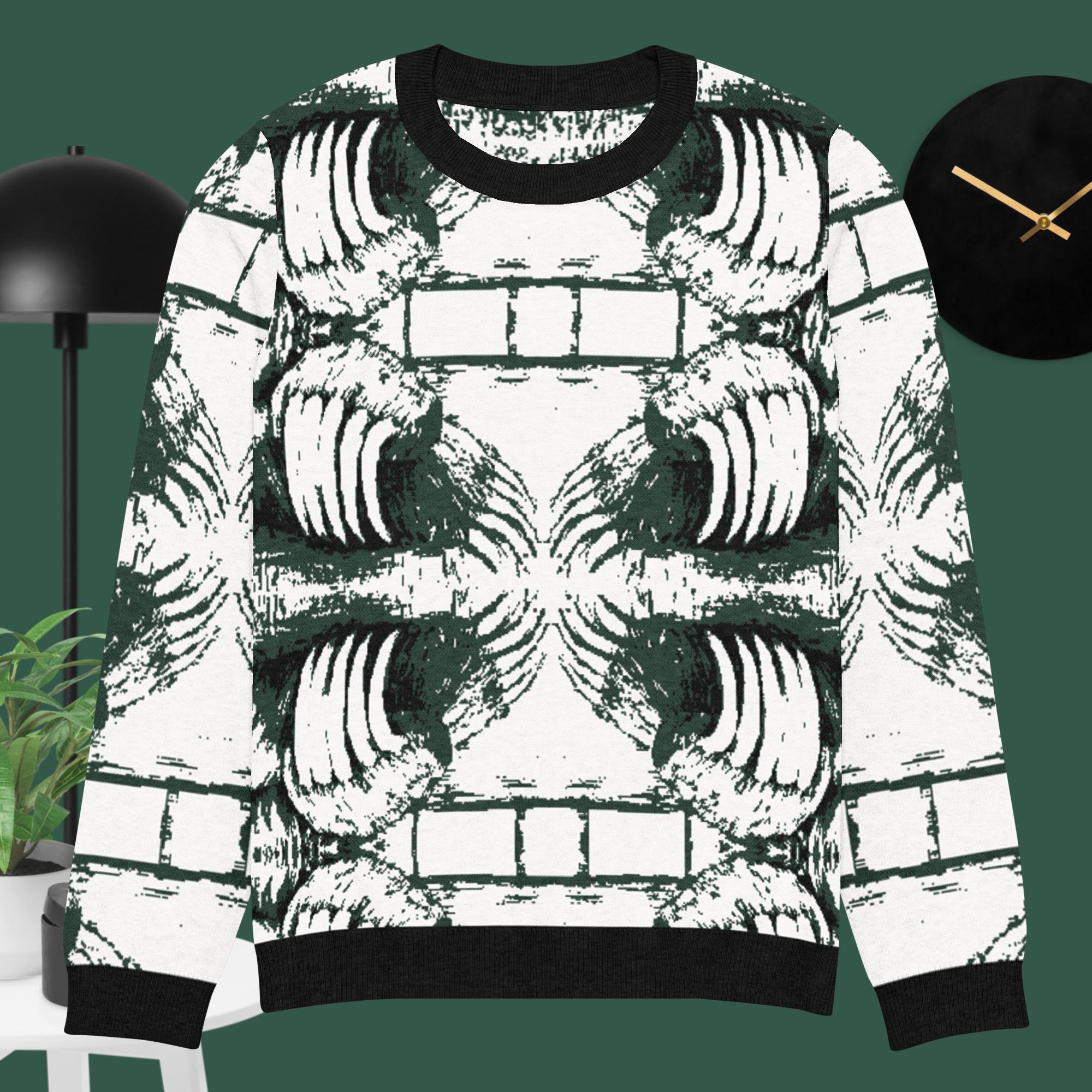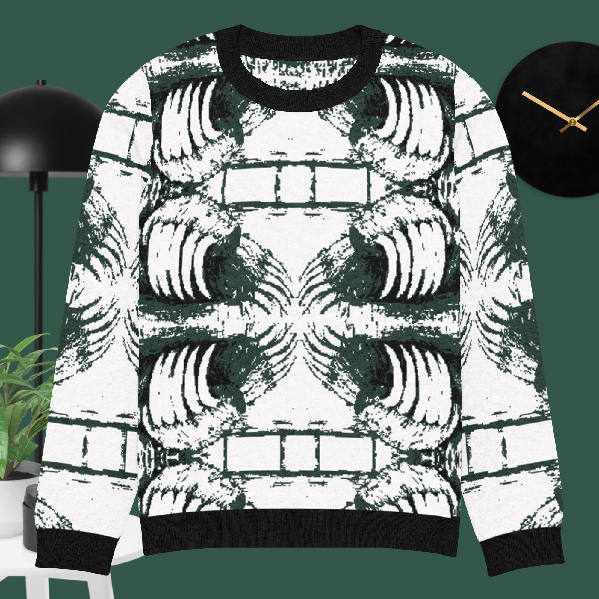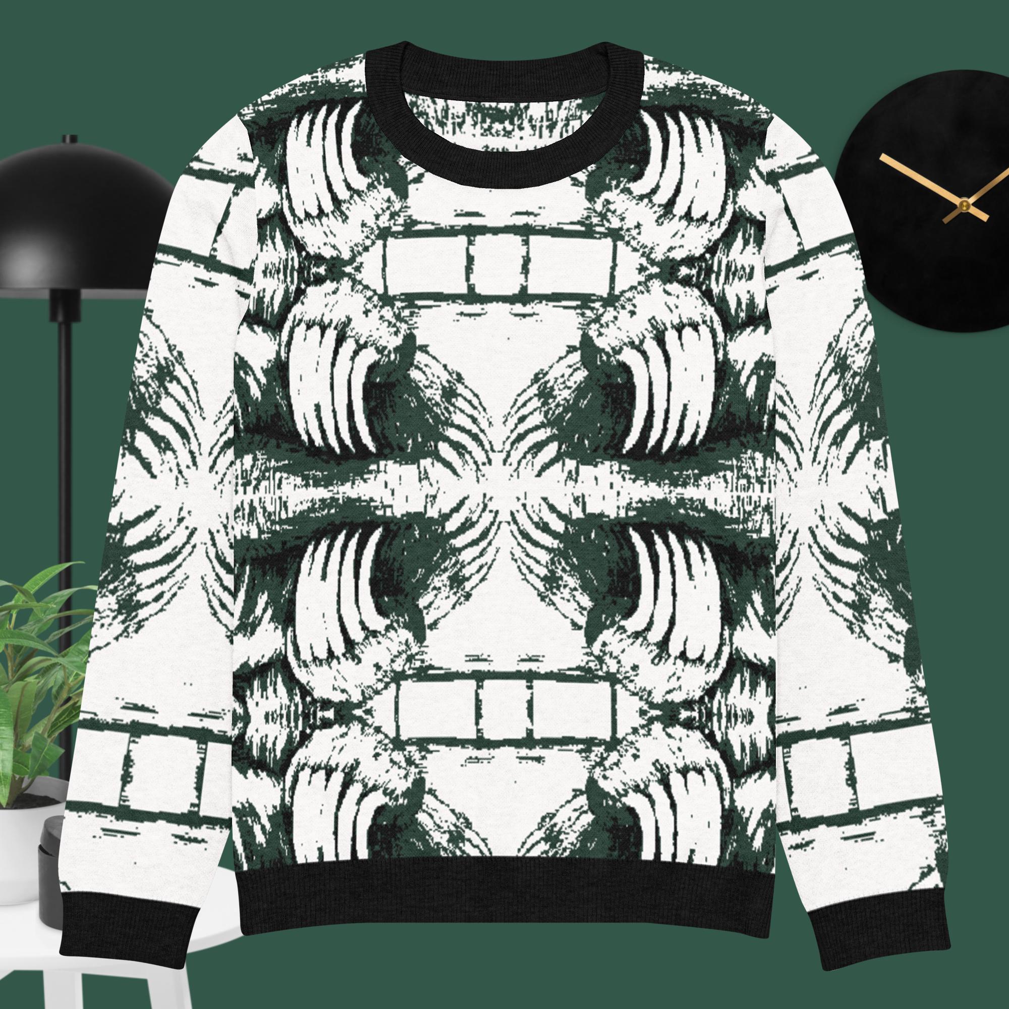 Bear Claw knitted crew neck sweater is woven in black, white and forest pine green. Bear Claw sweater is fashioned after Tanya Tee Art_TLC artworks featured in her children’s book; Scared Bear Art & Inquiry. Making this wearable art for bear lovers and art lovers.