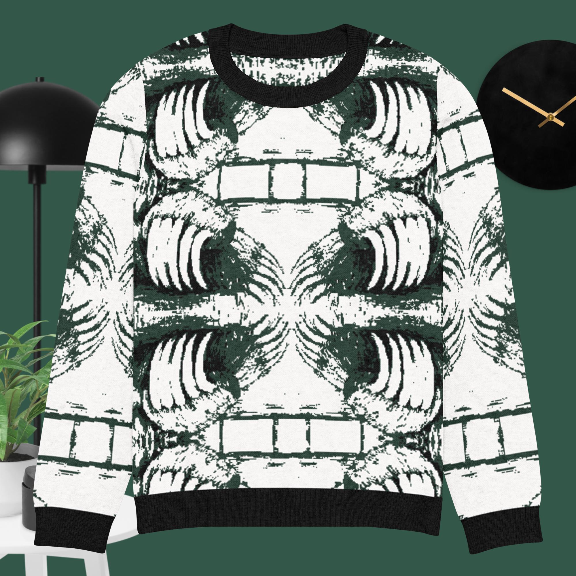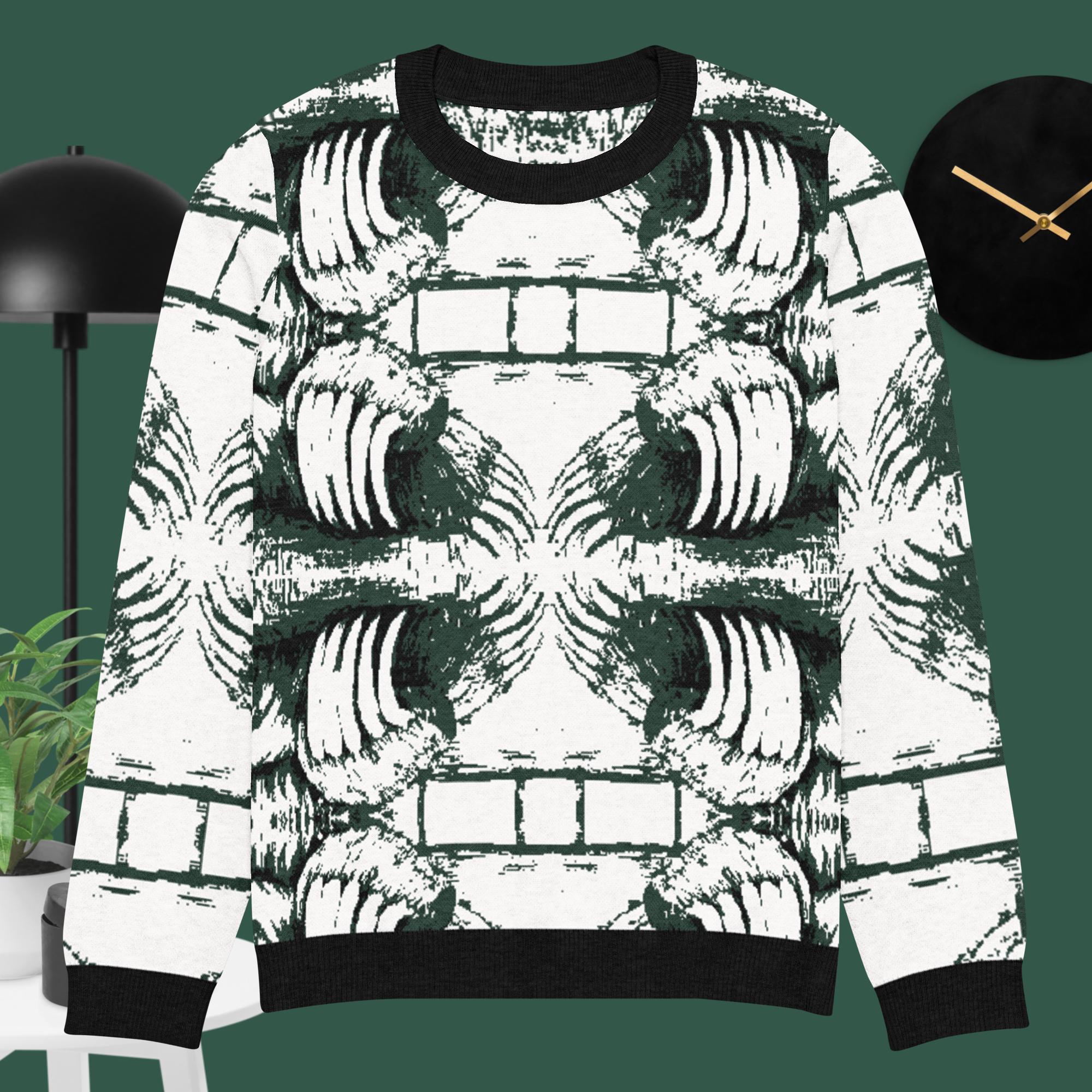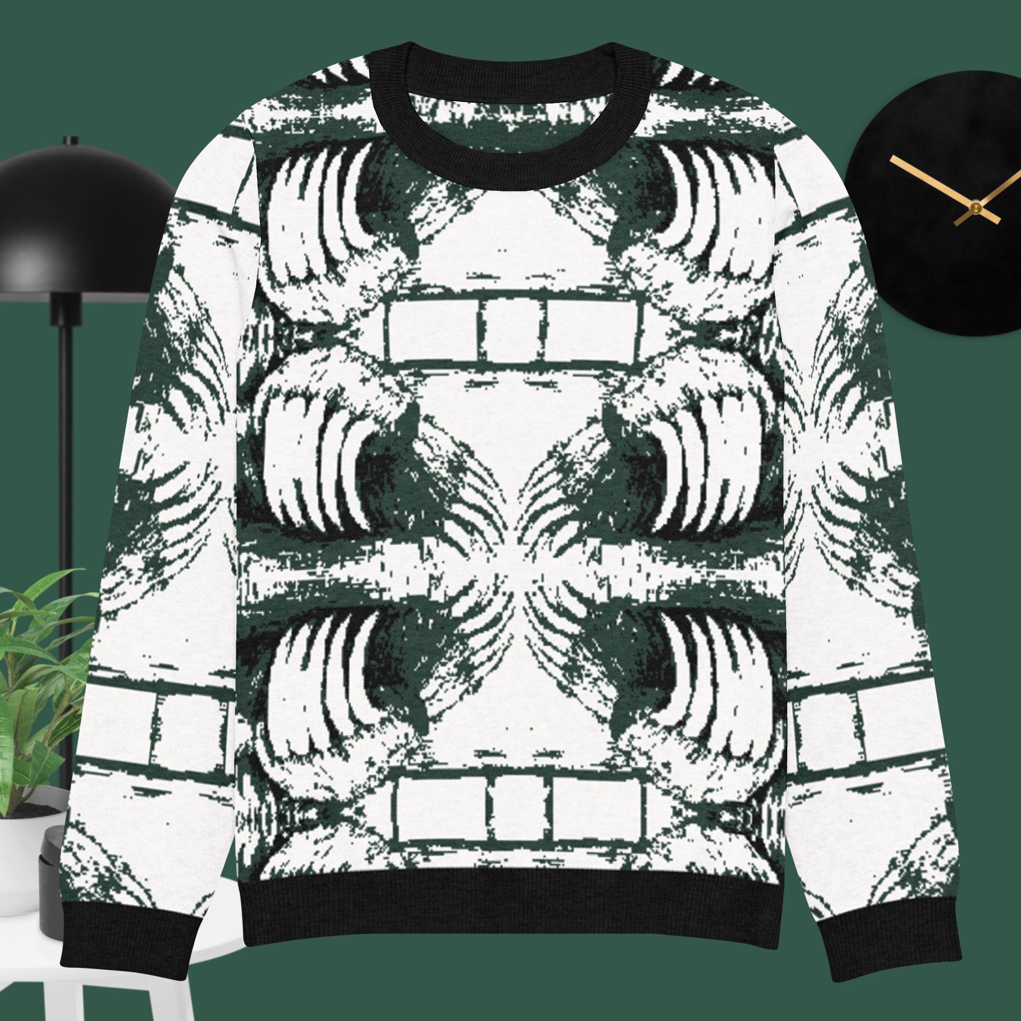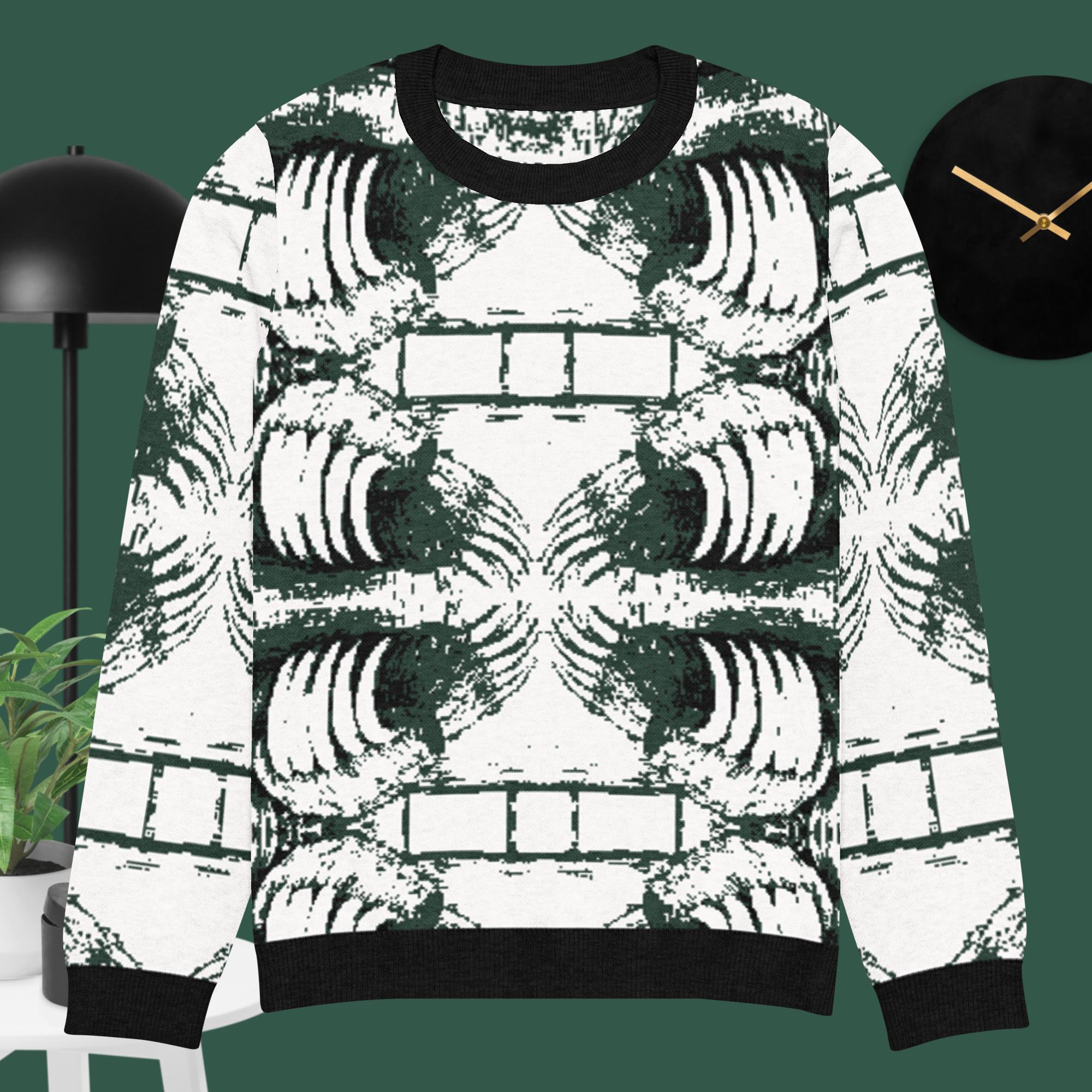 Bear Claw knitted crew neck sweater is woven in black, white and forest pine green. Bear Claw sweater is fashioned after Tanya Tee Art_TLC artworks featured in her children’s book; Scared Bear Art & Inquiry. Making this wearable art for bear lovers and art lovers.