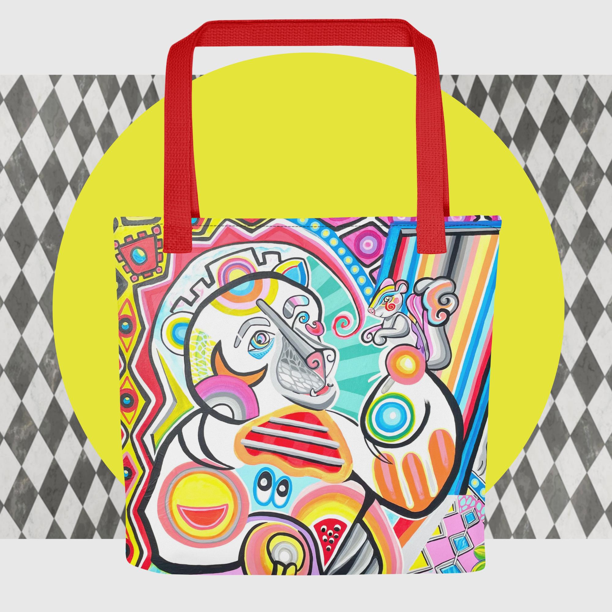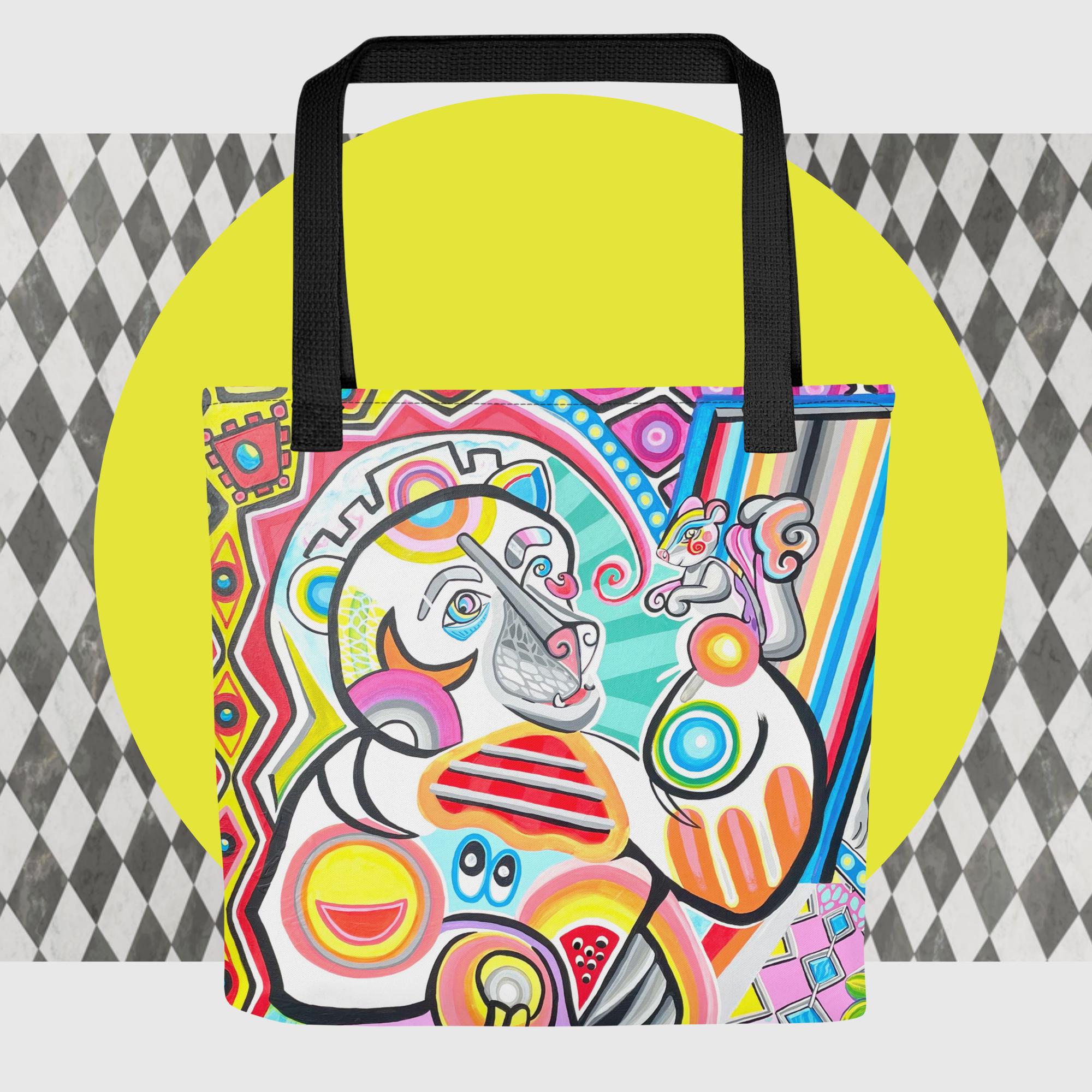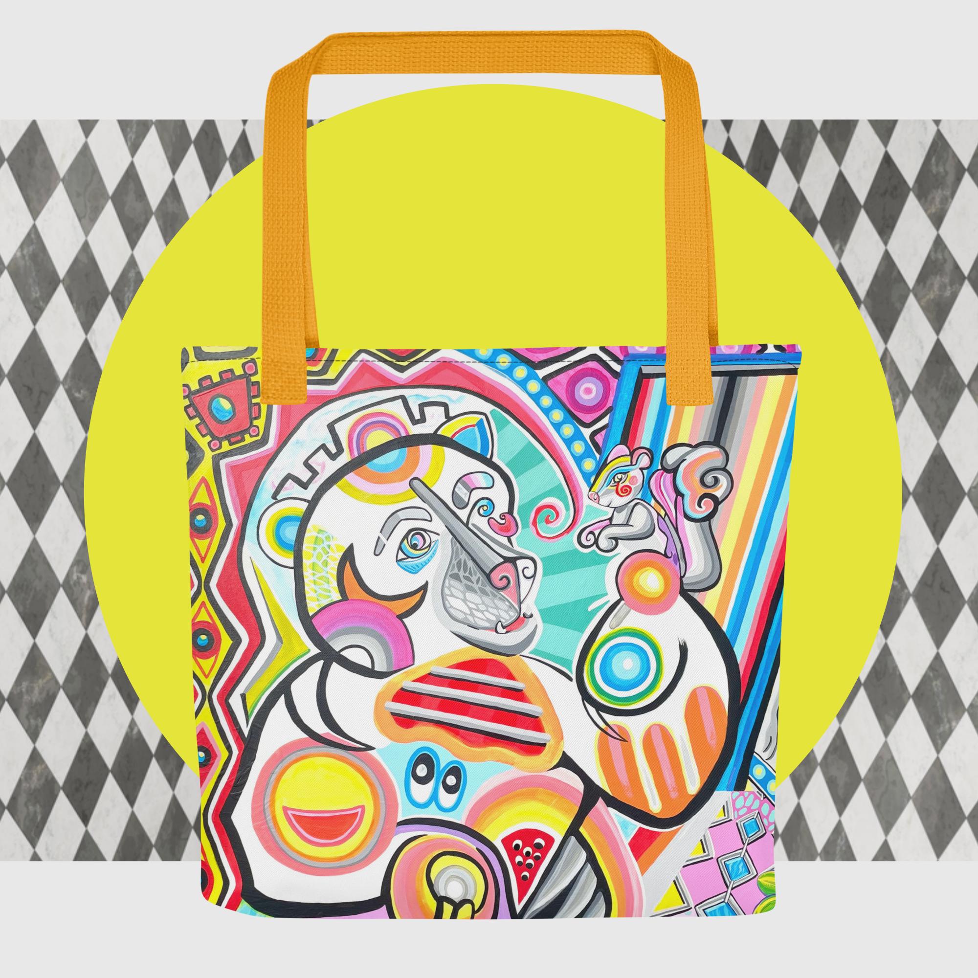 Carry a touch of whimsy wherever you go. Inspired by Tanya Tee’s playful painting, this sturdy tote features bold, artful imagery that blends humor and curiosity. Perfect for books, groceries, or everyday essentials, it’s both practical and a conversation starter.