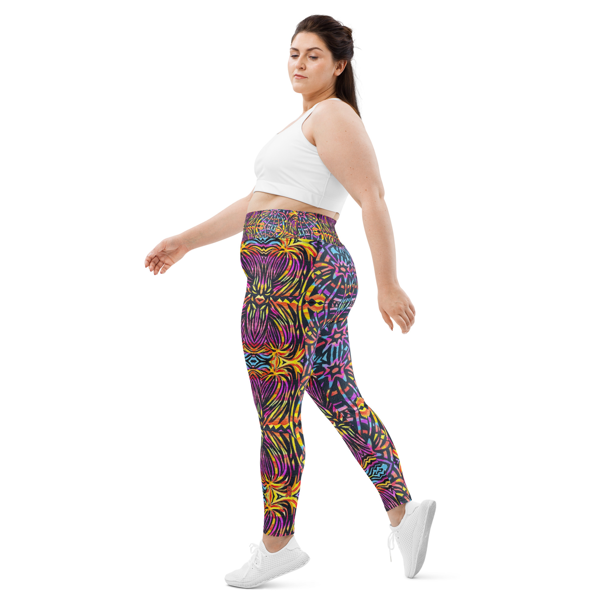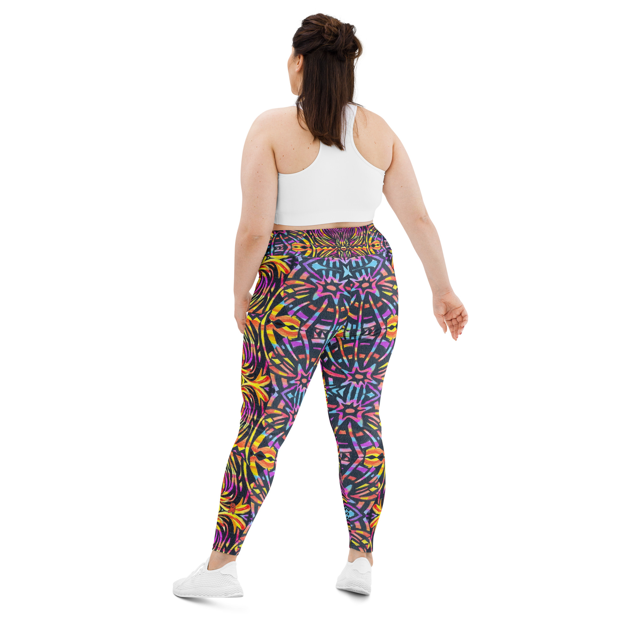 BoomBoom Tights Plus are a wearable pulse — a visual rhythm born from the Scared Bear lineage. Where Bear Claw strikes, BoomBoom echoes. These leggings feature a kaleidoscopic pattern in purple, yellow, orange, and blue, designed to move with your body and amplify your presence. The high-waisted fit offers sculpting support and breathable comfort, while the inclusive sizing ensures every body gets to dance in its own frequency. BoomBoom Tights Plus are not just fashion — they are vibration, celebration, and mythic motion.