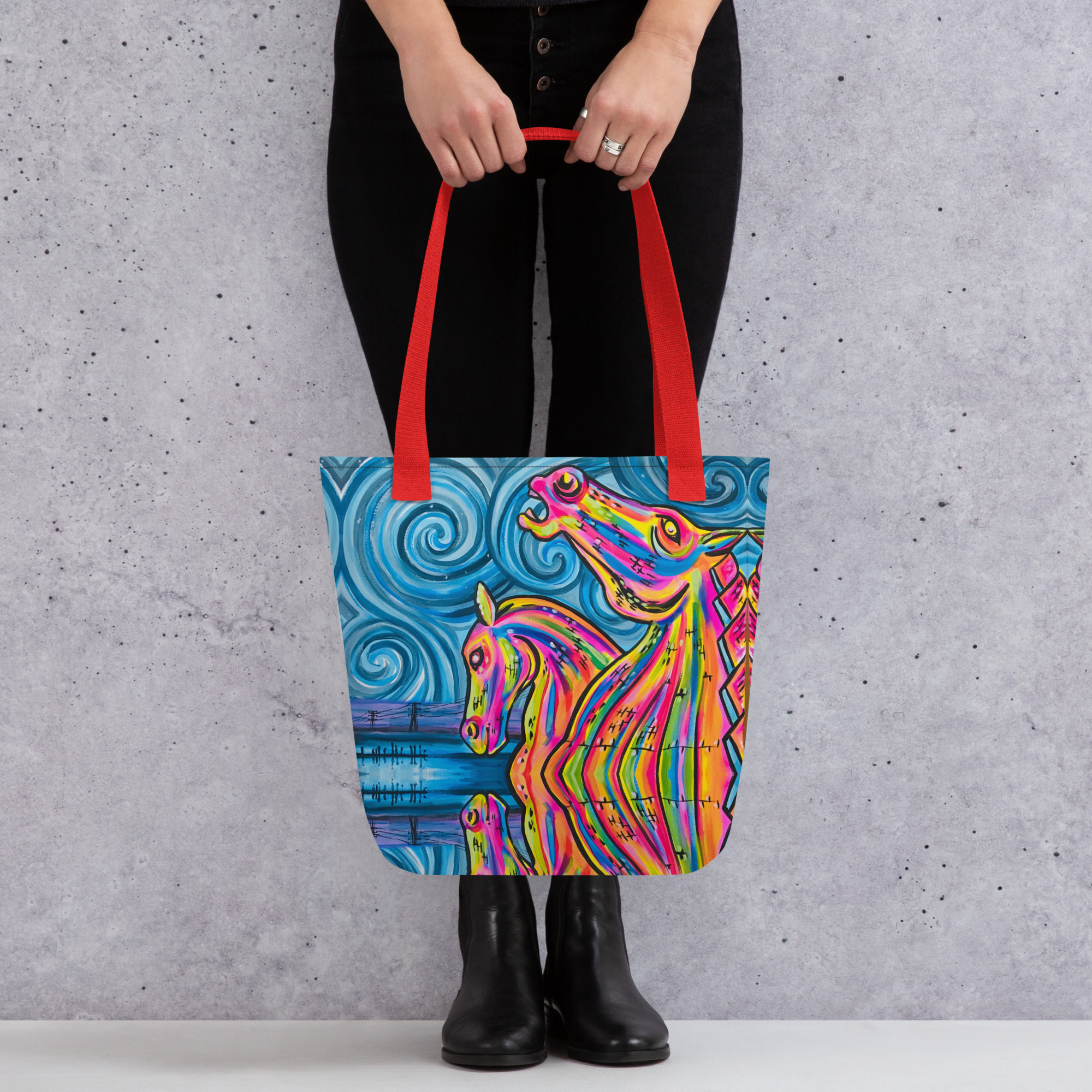 Kelpies tote Bag is designed after the famous Kelpies in Scotland, when they light up the night sky. Carry the Kelpies, Scottish landscape and story with you every where.