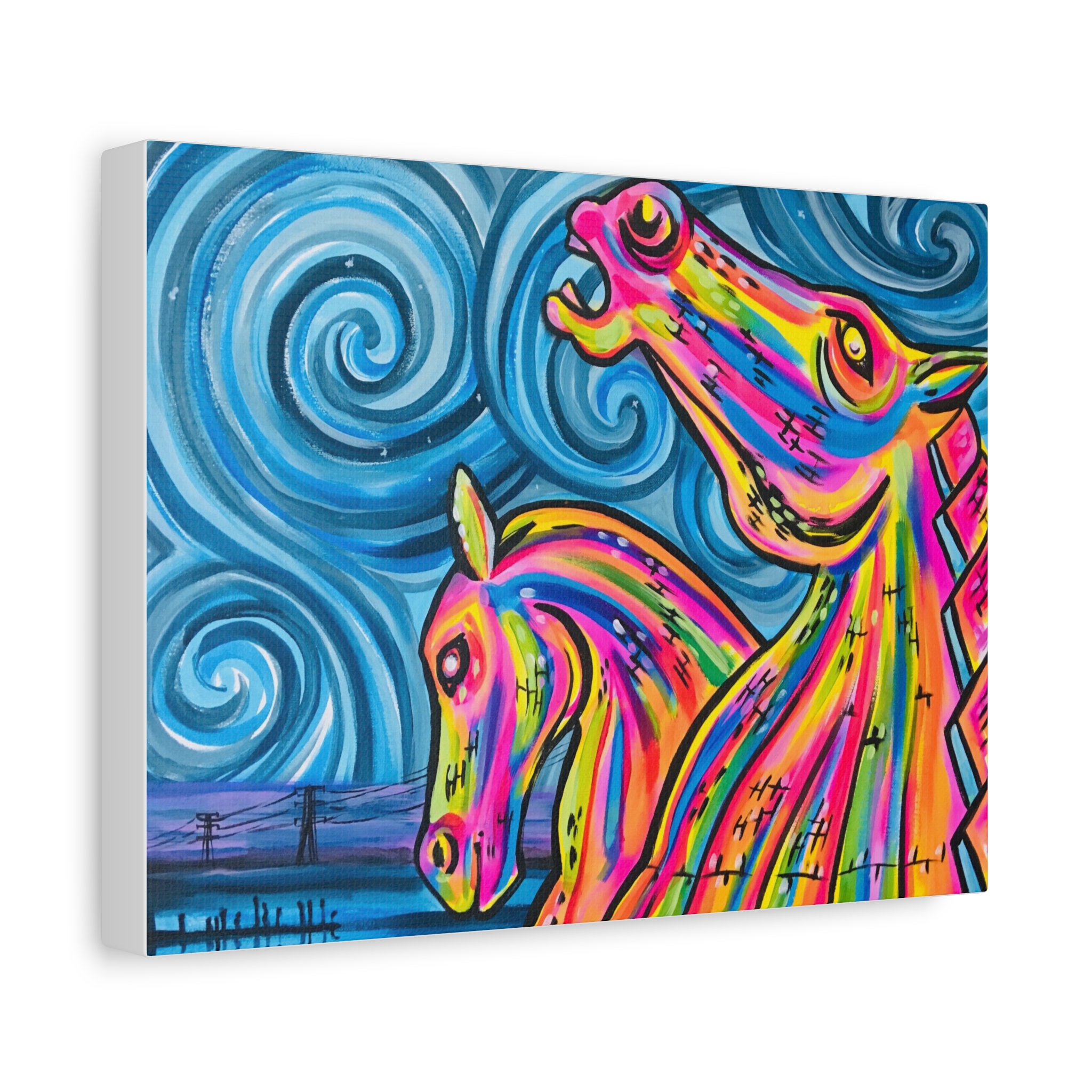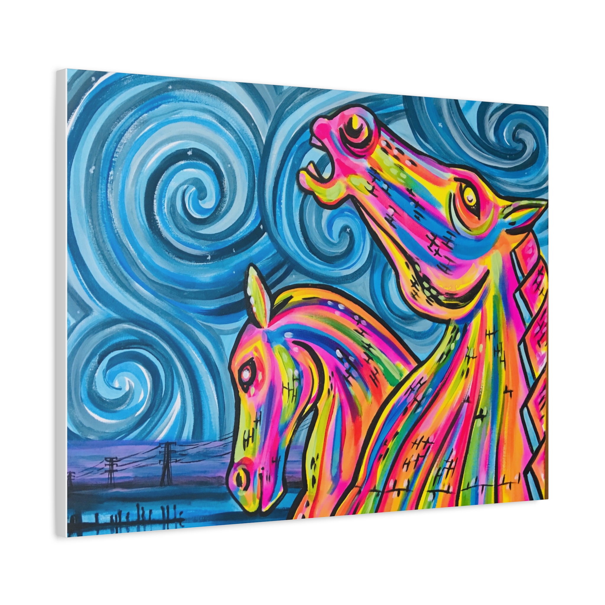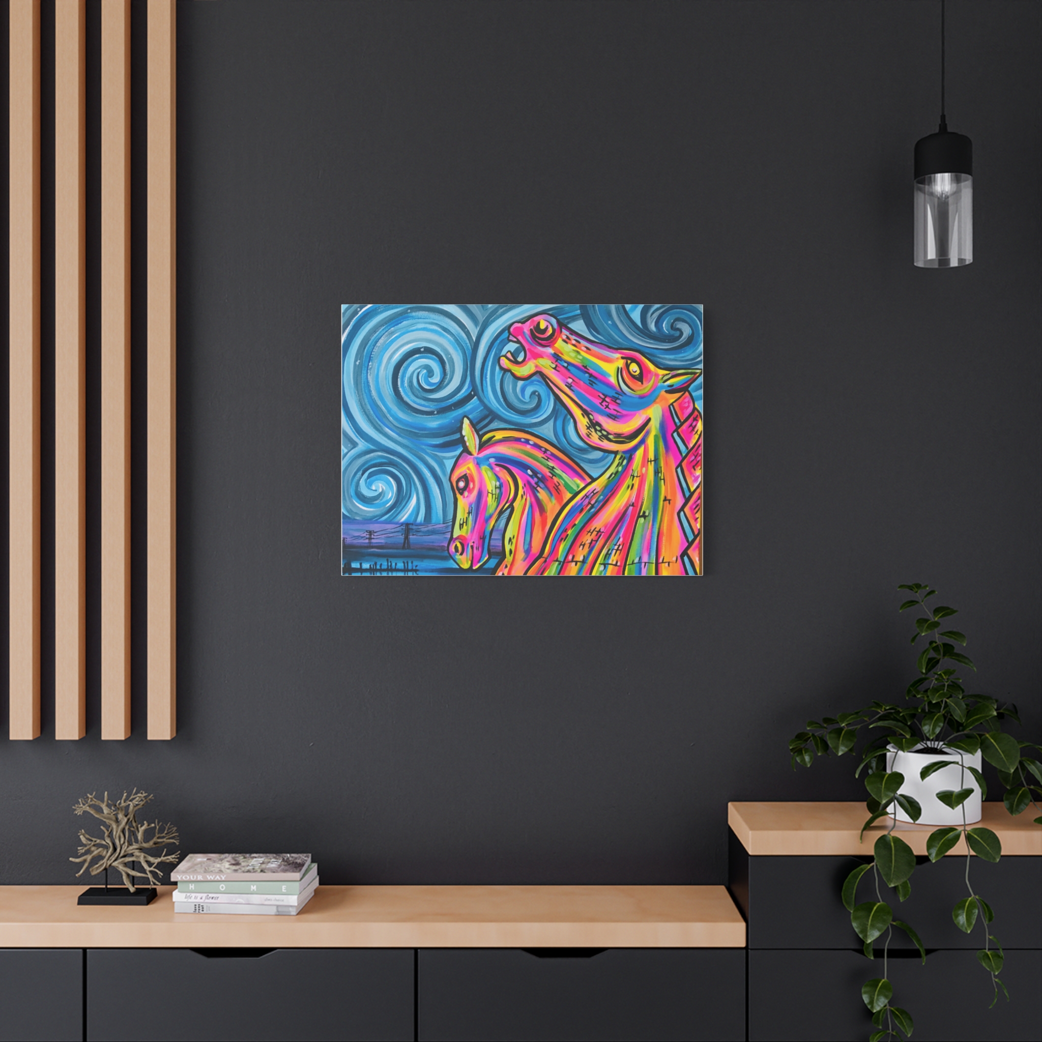 A vibrant stretched matte canvas that brings energetic color and motion to any wall. Bold neon horses leap across a swirling blue sky, rendered with rich, high‑quality inks on a durable cotton‑poly canvas. The 1.25″ gallery-style depth and hand-stretched pine frame give it presence without overpowering a room. Lightweight and ready to hang, this piece feels like a burst of street-art joy — great for brightening living rooms, studios, or entryways where bold expression matters.