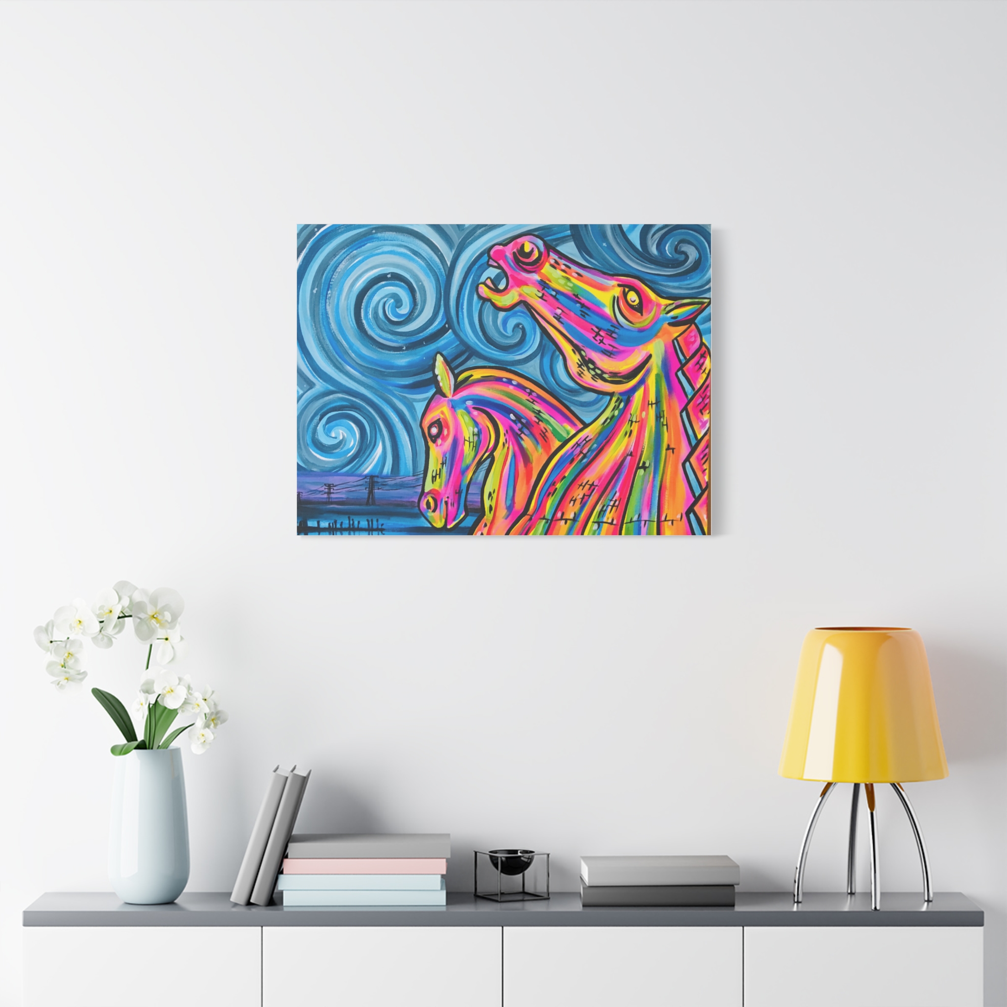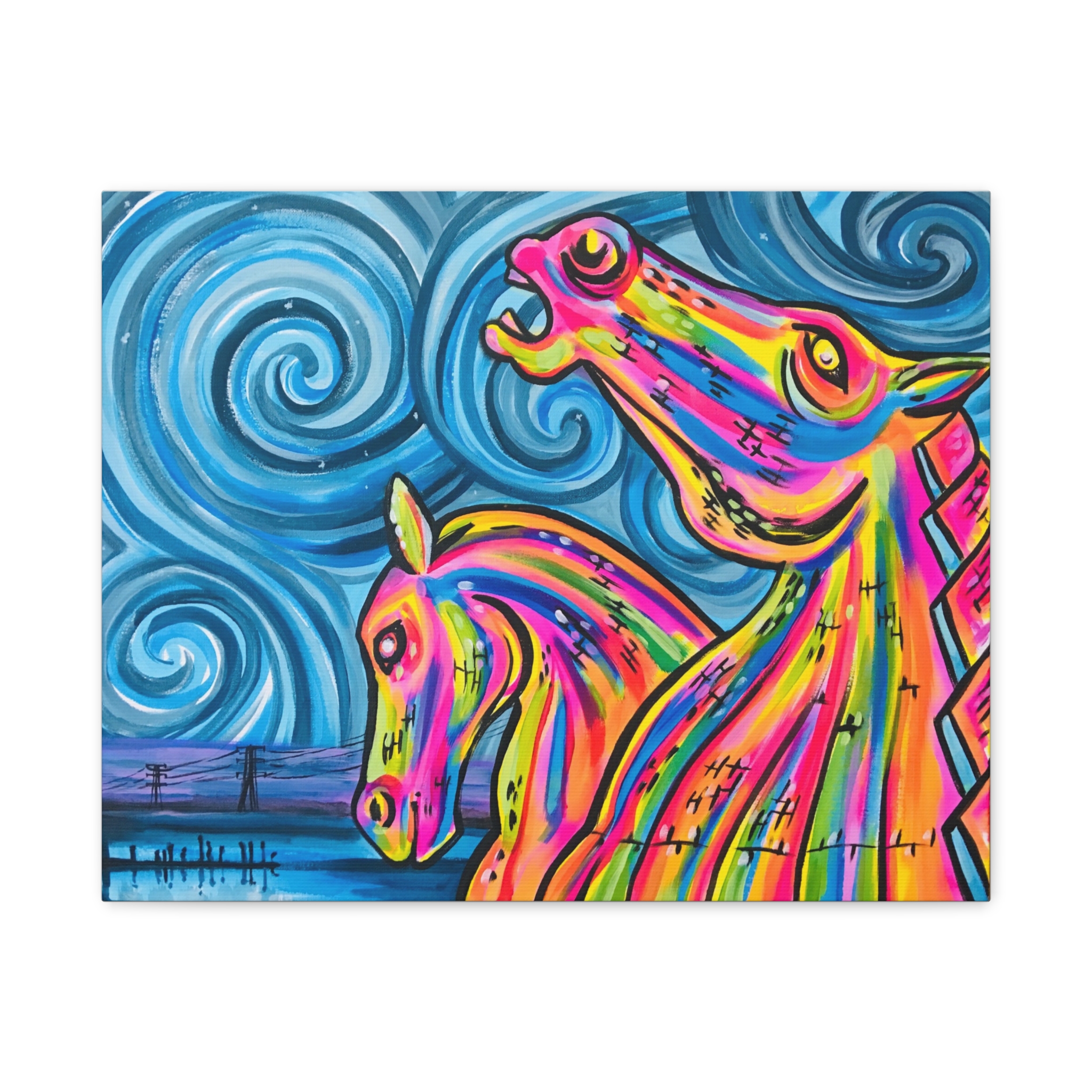Kelpies at Night canvas art, depicts the famous Scottish sculpture located in Falkirk, Scotland. This art reproduction is printed on quality cotton canvas and pine wood frame. These magical beings, Kelpies, resembling megalithic neon horses, light up the night sky and have a signifigant meaning to the land and culture; the mythical Kelpies. Originally painted in acrylic on canvas, this reproduction professionally reproduces the vibrant colours and detailed brush strokes. Available in three sizes: