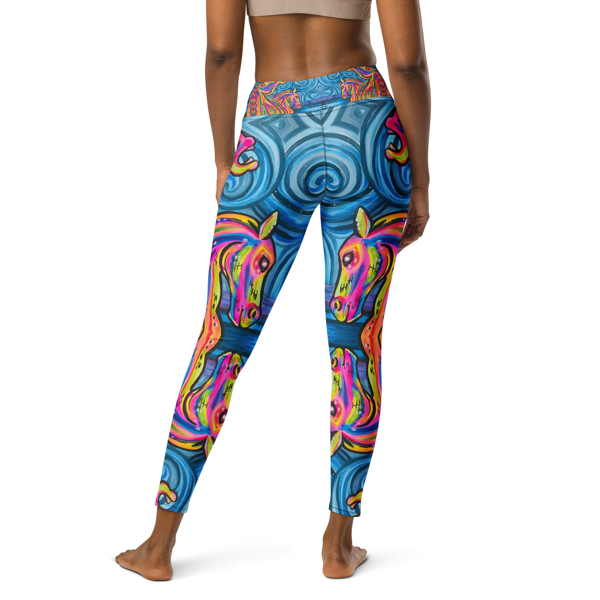 The Kelpies Leggings feature a vivid, multi-coloured illustration of stylized kelpie horse heads arranged in a symmetrical, swirling composition. Bright pinks, yellows, oranges, and purples stand out against a dynamic blue background, while the waistband showcases an ornate red‑blue‑orange pattern for added visual detail.