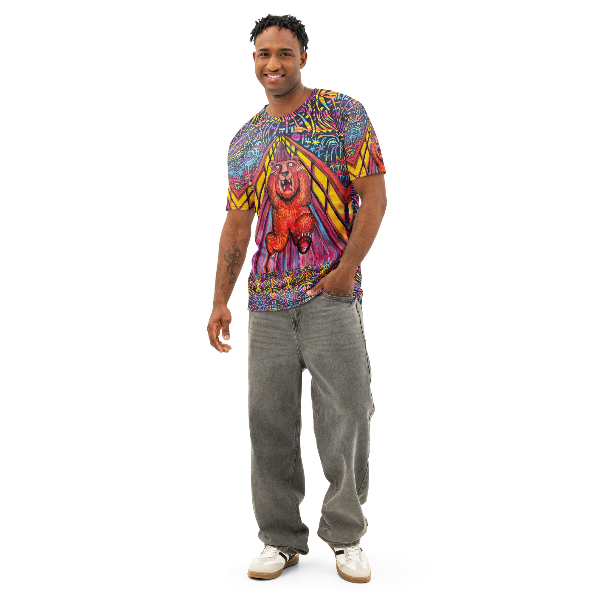 The Scared Bear Tee Shirt brings expressive colour and bold personality to a classic unisex fit. This multicolor illustration of fireworks and the Bear includes stylistic elements inspired by Edvard Munch’s The Scream, giving the design a dramatic and playful edge. Created by Tanya Tee Art_TLC (aka Tanya tee Coghill), the artwork adds a vibrant focal point to a soft, midweight cotton tee.